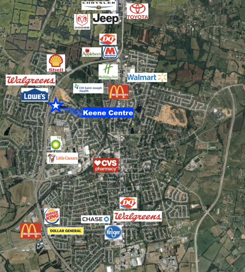 Keene Centre is a Class A, 100% occupied, shopping plaza located in Jessamine County, one of the fastest growing counties in Kentucky. The development is located on a major Highway that enjoys approximately 33,418 cars per day and is in the immediate vicinity of numerous residential and rapidly growing commercial developments.